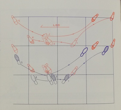 ナチュラルスピンターンを終わって、男女ともに(1)のステップから始まりSQQSSで(5)までで、1~4は一直線上に動いているのです
